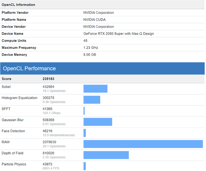 近日,RTX 2080 Super移动版显卡在Geekbench4数据库中被发现,显示拥有48组计算单元,也就是3072个CUDA核心,跟桌面版RTX 2080显卡一样,但频率最高只有1230MHz,比桌面版动轴1.8GHz的频率低了很多,可以推测这是一张Max Q版,TDP功耗相比桌面版少了170W。