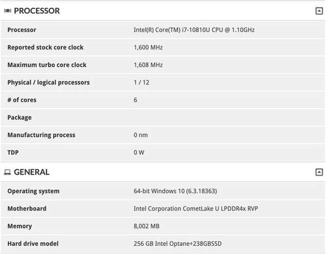 目前,3DMark跑分数据库中已经出现了i7-10610U及i7-10810U这两款全新型号,识别为K1步进版本,并已经支持LPDDR4X内存,但是具体频率和最高睿频识别不准确。