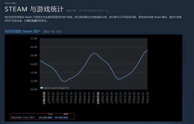 就在一周前也就是2月2日,steam的在线用户人数达到了1880万,创下历史新高。而仅仅不到两周后,这个记录再次被刷新。2月9日,根据Steam官方统计的数据,Steam平台同时在线人数峰值在今晚突破了1910万大关,具体数字是19107683人。
