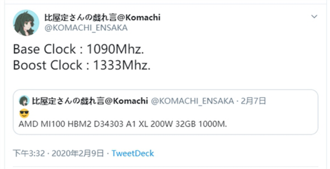 2月10日消息,知名爆料者@KOMACHI_ENSAKA近日在其推特公布其发现了一款AMD的新品,预计将会是AMD Radeon Instinct MI100。