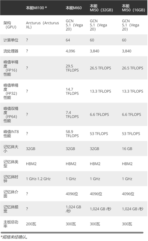 MI100预计会采用Arcturus核心,此前这个核心被认为是AMD在Navi后的GPU核心命名,不过后来被AMD证实是用于服务器专业加速卡产品的代号。据爆料,Arcturus核心的流处理器数量对比MI60会有一个明显的飞跃,直接翻倍来到了8192个流处理器,同时显存频率可能也会来到1.2GHz,不过核心频率不高,基础频率1090MHz,Boost频率1333MHz。