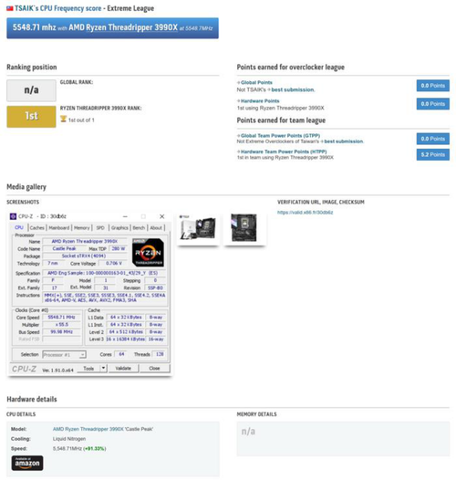 这名超频玩家ID为TASIK,其所使用的主板为微星MSI Creator TRX40主板,配合单条1866MHz的DDR4内存,时序为13-13-13-31。散热方面,自然不用多说,能够压制住这样一颗怪兽的也只有液氮了。