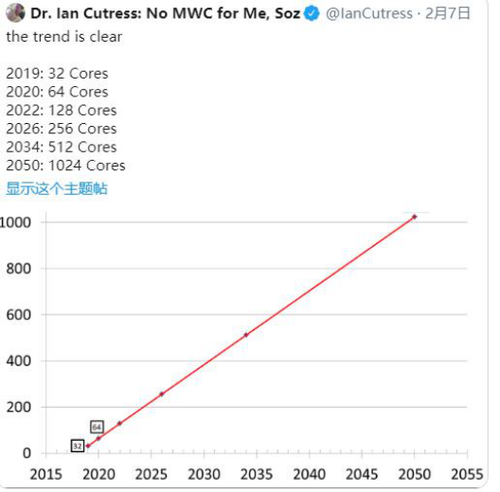 根据他的猜想,2022年会出现128核CPU,2026年核心数可能再翻一倍,达到256核心,到30年后的2050年则会出现1024核CPU。