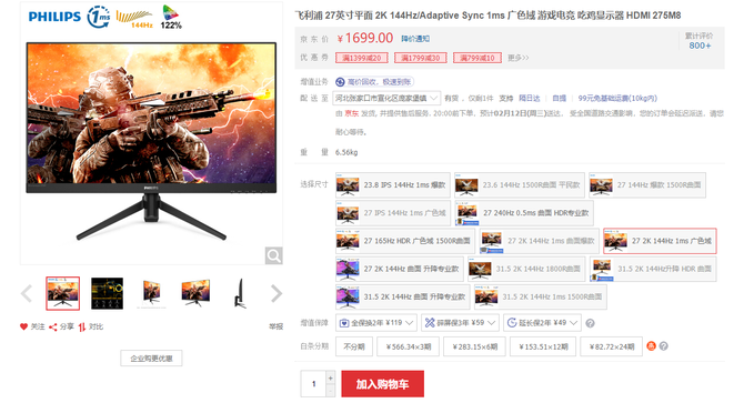2K+144Hz+1ms相应 飞利浦猛腾275M8电竞显示器