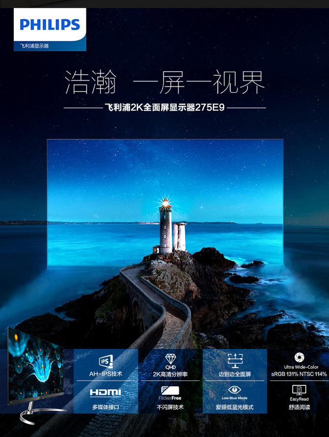 飞利浦275E9显示器是一款2K高分辨率的显示器,这款显示器采用了原厂的LGD AH-IPS屏幕,显示效果出众,不光有超大的可视角度,在色彩上,131% sRGB色域和114%NTSC色域的加持让这款显示器的视觉效果非常突出,不论是文档的阅读还是专业的修图,均能够轻松胜任。