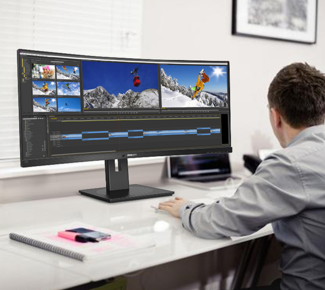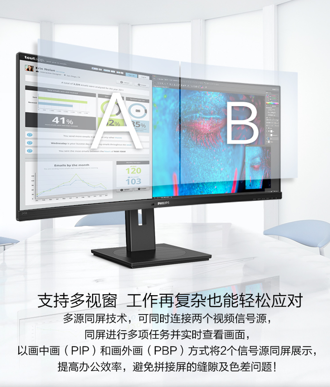 飞利浦345B1CR采用的是超宽曲面屏的设计,分辨率为3440X1440,屏幕比例为21:9超宽带鱼屏,同时1500R的曲率设计,让这款显示器带给用户较好的沉浸式的游戏体验。不光如此这款显示器采用带鱼屏的设计,所以在办公方面也是非常不错的,分屏多任务,让你的办公效率大幅提升。