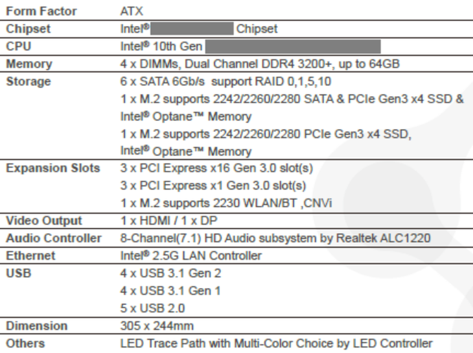 日前,有外媒放出了一份主板的规格表,虽然在关键型号处打了码,但是配合的CPU却明确为第十代英特尔处理器。从规格来看,这应该是一款定位高端的Z490芯片组主板。这张主板提供了4条内存插槽,支持双通道DDR4 3200+MHz内存,最大支持64GB内存容量。主板提供一个HDMI和一个DP视频输出,支持英特尔2500Mbps有线网卡。
