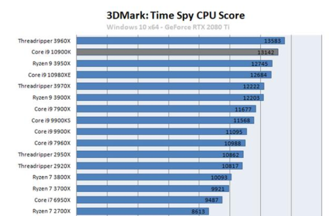 而在更早的偷跑中,酷睿i9-10900K运行Time Spy项目物理分数高达13142,仅次于24核心线程撕裂者3960X,比16核心的AMD消费级旗舰处理器锐龙9 3950X还要略强一点。