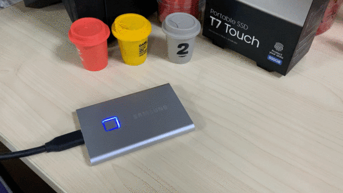 与前几代T系列移动固态硬盘相比,除了性能上的提升,T7 Touch还增加了指纹识别功能,并在指纹识别模块四周设计了动感LED灯带,能够帮助用户一目了然地评估驱动器的状态,并根据LED所显示的内容直观地辨别该状态。