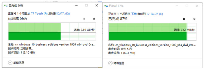 接下来我们再以实际文件读取的方式来看看这款移动硬盘的表现。文件的传输速度也受文件类型所限制,比如单个文件,一个文件夹下的多个文件,主要是图片、视频或游戏程序文件等。首先我们选取了微软Windows 10安装程序,单文件大小为4.9GB,从T7 Touch复制到PC为读取,速度达到2.69GB/s,复制过程非常稳定。