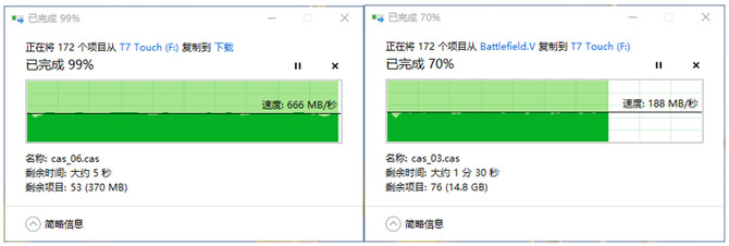 然后我们再选择复制一个更大的多个文件,《战地Ⅴ》游戏约50GB。可以看到其读取的速度约为666MB/s,整个将近200个项目文件读取过程同样非常稳定。