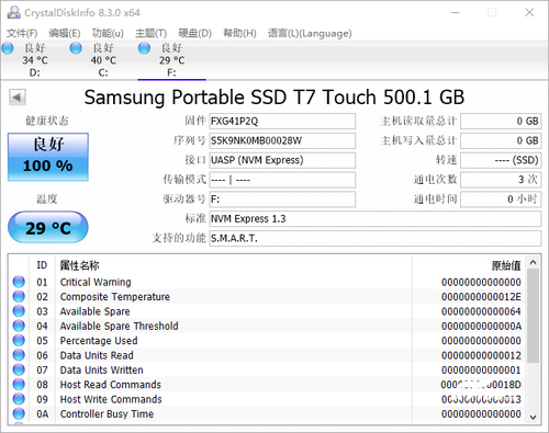 使用CrystalDiskInof识别硬盘信息,可以看到其接口为NVMe,支持UASP传输协议,该协议能够使大容量储存设备的传输速度高达20%,并降低CPU的利用率、数据延迟和等待时间。