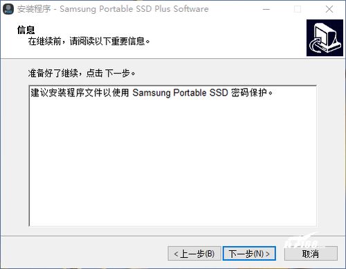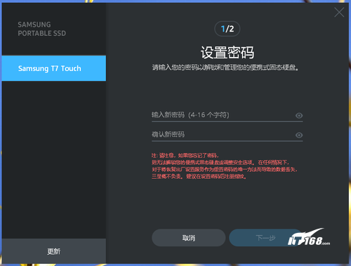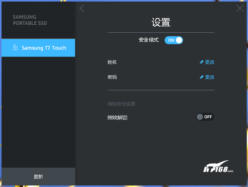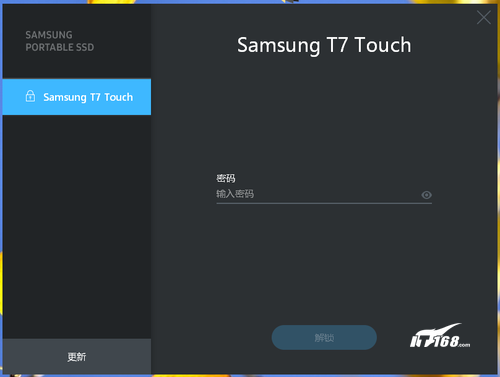 我们评测的这款T7 Touch标称容量为500GB,内置三星移动固态硬盘管理软件,也就是密码登录管理,首次在PC上使用,可以双击该程序,并根据提示进行设置。磁盘文件系统格式为exFAT,能够满足大文件数据拷贝。
