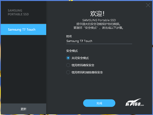 在欢迎界面里,你可以给你的硬盘设置一个名字,安全模式里,你可以不设置加密,也可以仅使用密码,或者是密码+指纹的方式,若要使用指纹,则必须输入密码。