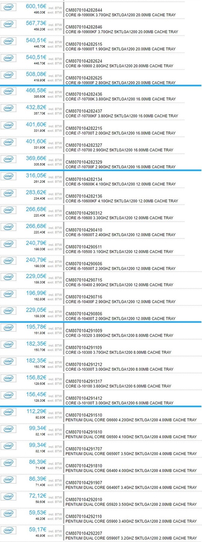 上次外媒已经曝光了多达22款新型号,但唯独缺少35W T系列节能版。现在,又有一家欧洲电商将十代桌面酷睿的全部32款型号都提前摆上了货架,而且给出了每一款型号的价格。