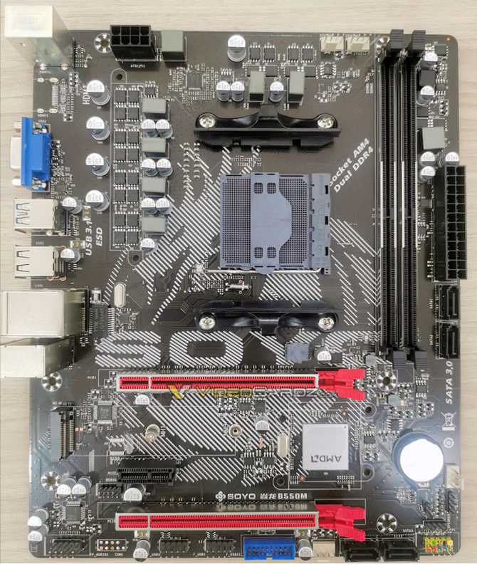 不过外媒VideoCardz在今天正式公布了一张来自SOYO梅捷的B550主板,名为焱龙B550M,是一张真正的面向消费市场的产品。这张主板采用M-ATX板型,AM4插槽。主板的供电部分不算豪华,CPU供电为单8pin,但主供电和南桥芯片组部分都留有螺丝孔位,推测正式售卖时会加下散热鳍片。接口上提供了两条DDR4内存插槽,支持双通道,提供了一个M.2规格接口,应该支持最长2280规格的NVMe固态硬盘。