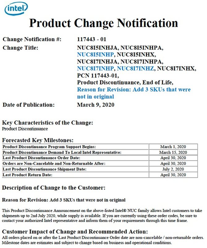 本月,英特尔正式对外发布了一份UCFF系统的产品变更通知,计划将终止大部分基于Whiskey Lake的八代NUC机型的销售。与其他EOL转型一样,英特尔为自己和客户留了一些缓存时间,NUC 8 系列最终出货将在7月份完成。