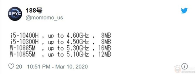 此外,这次爆料中还有两款第十代酷睿i5处理器,10400H和10300H,8MB三级缓存,最高睿频分别为4.6GHz、4.5GHz,比目前的9300H更高。