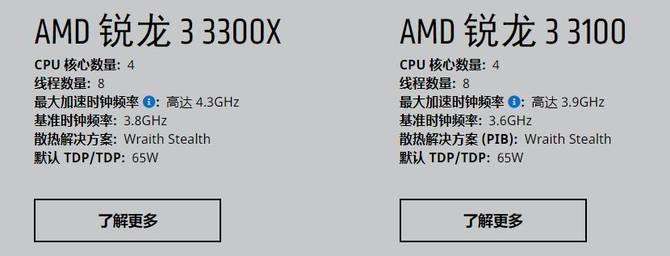 锐龙3 3100和锐龙3 3300X这两款产品规格均为4核心8线程,TDP为65W,并且也都提供了2MB二级缓存和16MB三级缓存,大容量高速缓存的加入可以在一定程度上弥补高内存延迟;两款处理在频率上有所区别,锐龙3 3300X的基础频率为3.8GHz、高加速频率4.3GHz,售价120美元,而锐龙3 3100的基础频率为3.6GHz、高加速频率3.9GHz,售价99美元。