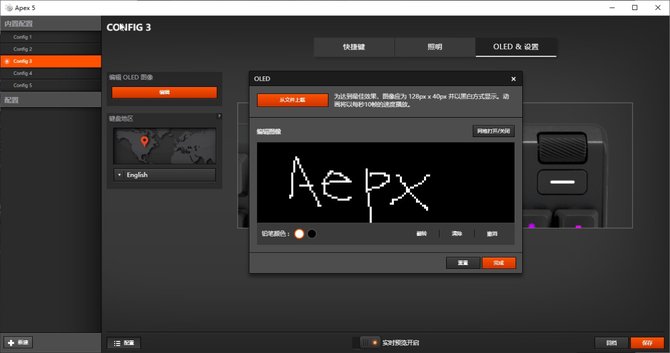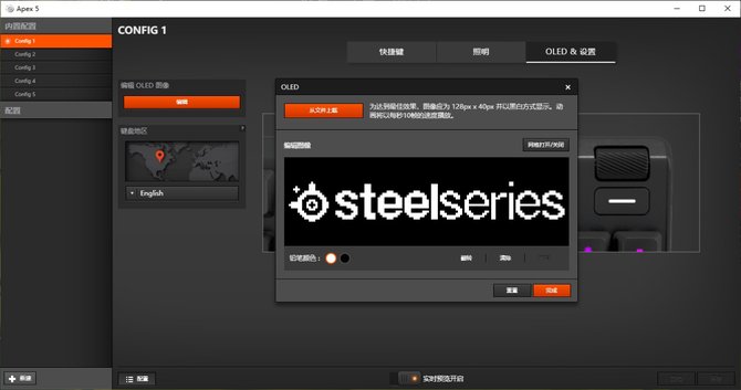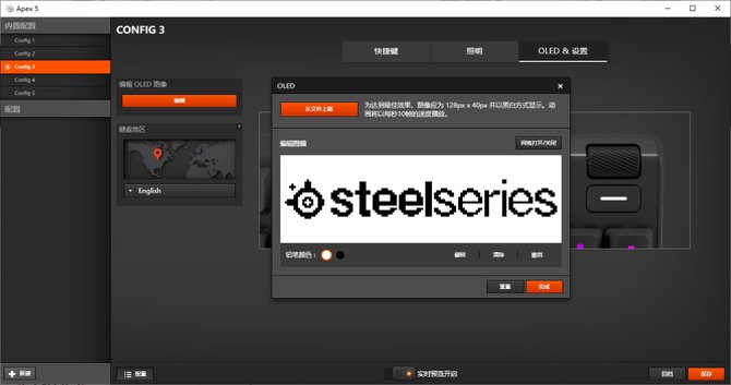 用户可以通过SteelSeries Engine 3软件对键盘的灯效、OLED显示屏等进行设置,包括完全手动自定义的图案或文字,都可显示在OLED上。
