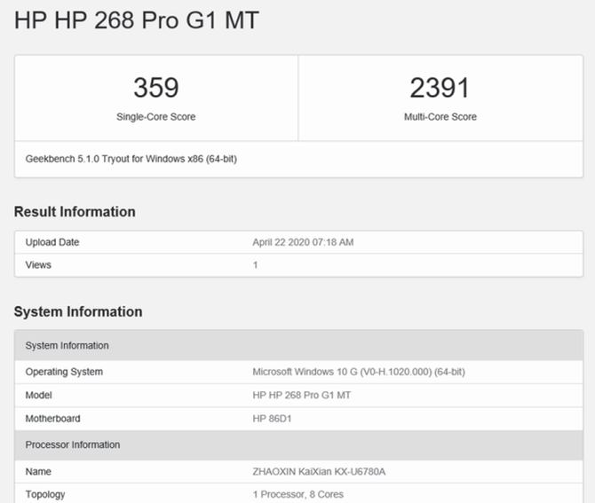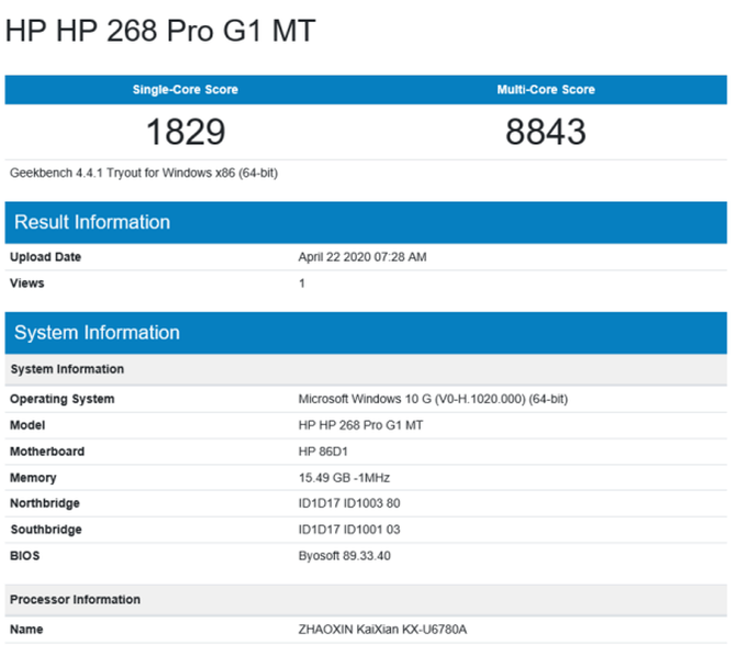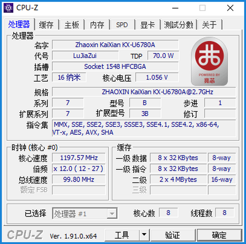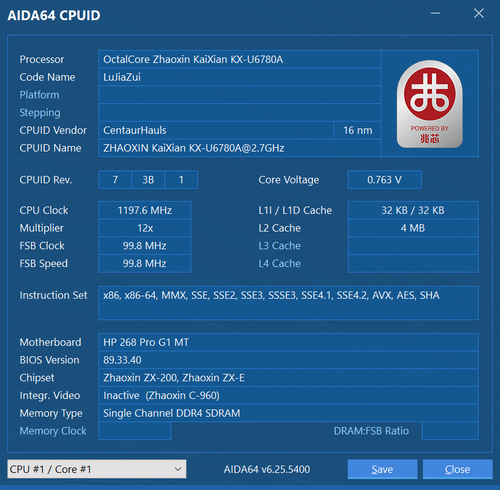 硬件上,HP 268 Pro G1搭载了国产化处理器,具体型号为兆芯开先E系列 KX-U6780A,16nm制程(由台积电代工)、8核心8线程,基础频率1.2GHz、最大睿频加速2.7GHz,二级缓存8MB,TDP为70W,同时支持SSE4.2、AVX、AES、SHA等主流指令集。CPU-Z 1.91和较新版AIDA64已经可以较好的识别这款处理器的信息。