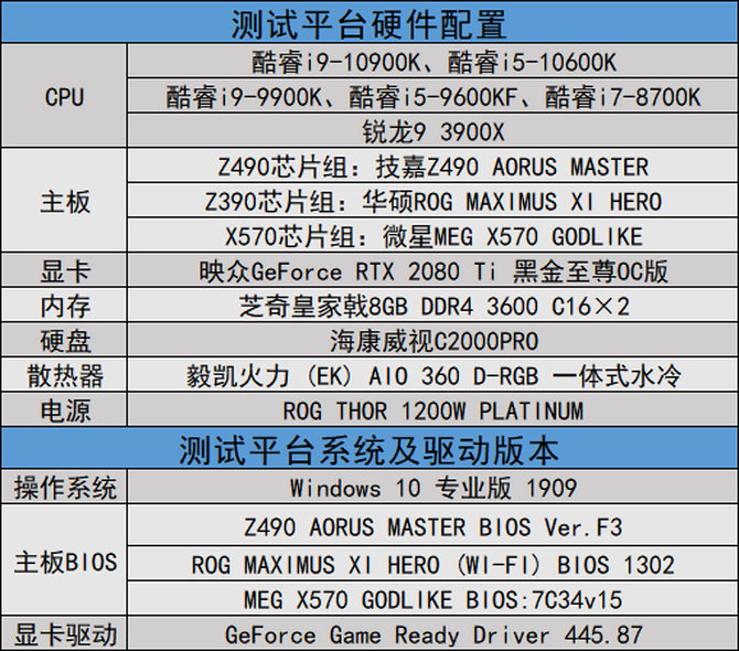 本次测试的处理器为酷睿i9-10900K与酷睿i5-10600K,并同步测试了酷睿i9-9900K、酷睿i7-8700K、酷睿i5-9600KF、锐龙9 3900X等热门型号的成绩来与之进行对照。为了各个处理器能够将性能发挥最大化,笔者在测试前搭建了优异的平台。