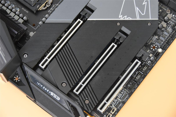 正面提供了3组搭载散热片的高速NVMe M.2插槽与3个PCI-E插槽,安装很方便。