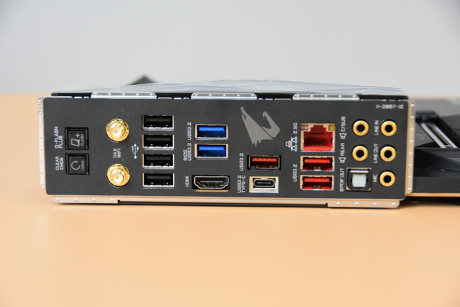 背部的IO部分,提供了Q-FLASH按钮、清除CMOS数据按钮、Intel® WiFi6 802.11ax + BT 5模块、1个HDMI插座、1个支持USB 3.2 Gen 2的Type-C接口、3个USB 3.2 Gen 2 Type-A接口(红色)、2个USB 3.2 Gen 1接口、4个USB 2.0/1.1接口、1个RJ-45网线接口、1个数字光纤输出接口、与音频模块等,提供了非常好的连接性与拓展性。