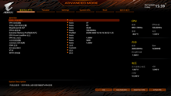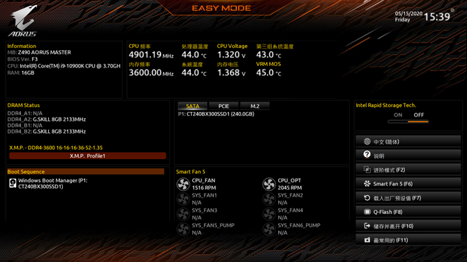 相比前代产品,技嘉Z490 AORUS MASTER从BIOS界面也有了一定的改进。EASY MODE模式的界面变得更加直观。