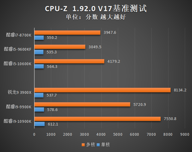 在V17版本的测试中,酷睿i9-10900K充分发挥了超高睿频的优势,单核性能超过610分,遥遥领先于直接竞品锐龙9 3900X;多核性能方面,酷睿i9-10900K也达到了7500分以上,相比酷睿i9-9900K提高巨大,很接近12核心的锐龙9 3900X了。而酷睿i5-10600K凭借高主频+超线程的特性,全面超越了酷睿i5-9600KF,相比酷睿i7-8700K也略强一些。