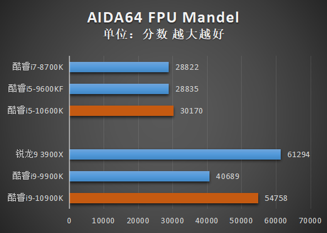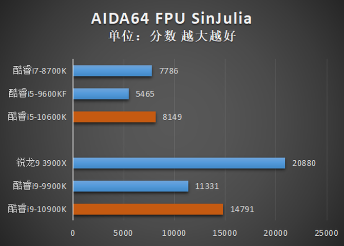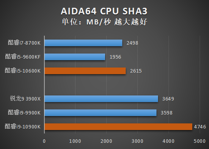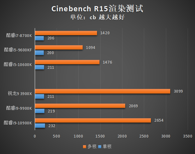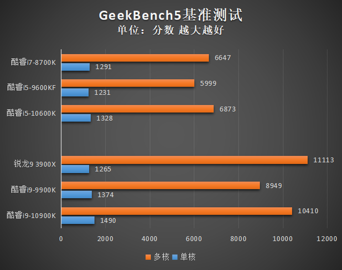 测试的结果与CPU-Z基本类似,酷睿i9-10900K在单核分数上领先酷睿i9-9900K,多核分数接近锐龙9 3900X。而酷睿i5-10600K也同样完成了对酷睿i7-8700K的小幅超越。