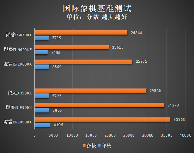 国际象棋是一款经典的测试软件,用它来衡量对比不同CPU的运算能力有一定的参考价值。单核分数方面,睿频高的酷睿i9-10900K再一次获得了领先,而由于国际象棋最大只支持16个线程,因此12核心24线程的锐龙3 3900X表现一般,酷睿i9-10900K相比酷睿i9-9900K在多核分数方面的提升也并不算大。