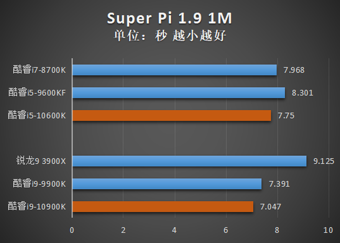 SuperPi是一款测试圆周率计算速度的软件,考验处理器的单核心性能。酷睿i9-10900K凭借着高达睿频,没有争议的获得了领先名。与此同时酷睿i5-10600K相比酷睿i5-9600K、酷睿i7-8700K也有一定幅度的提升。