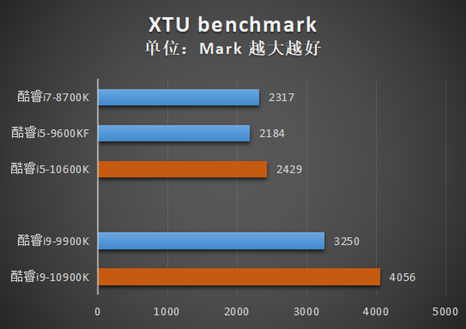 Intel Extreme Tuning Utility (XTU)不但可以调节处理器的电压、倍频、电流等设置,还自带了一个Benchmark用于测试性能。在XTU自带的测试中,分数基本可以随着频率/核心数的增长而线性提高,酷睿i9-10900K相比酷睿i9-9900K提高了接近25%,酷睿i5-10600K相比酷睿i7-8700K也有5%左右的提升。