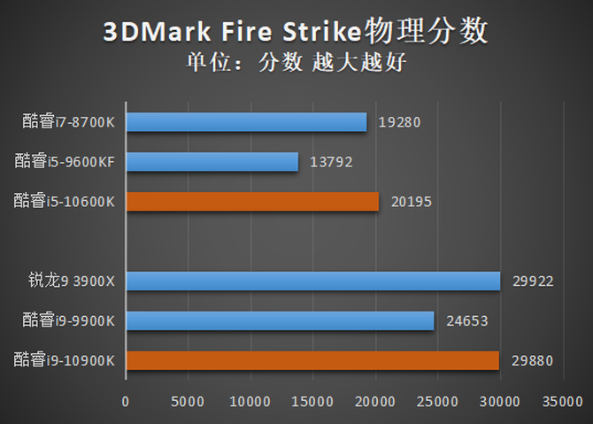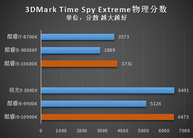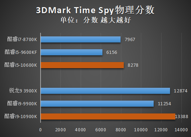 可以看到,随着核心/线程数增长,以及频率的提高,无论是哪个场景的测试,酷睿i9-10900K、酷睿i5-10600K相比与前代产品酷睿i9-9900K、酷睿i5-9600KF,都有了巨大幅度的分数增长。具体来看,在Fire Strike与Time Spy Extreme两个场景中,酷睿i9-10900K的分数已经和拥有更多核心数量的锐龙9 3900X基本持平。而在Time Spy测试中,酷睿i9-10900K则完成了对锐龙3 3900X的超越。可见超高的睿频,在一定程度上确实可以弥补核心数量的劣势。