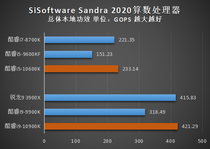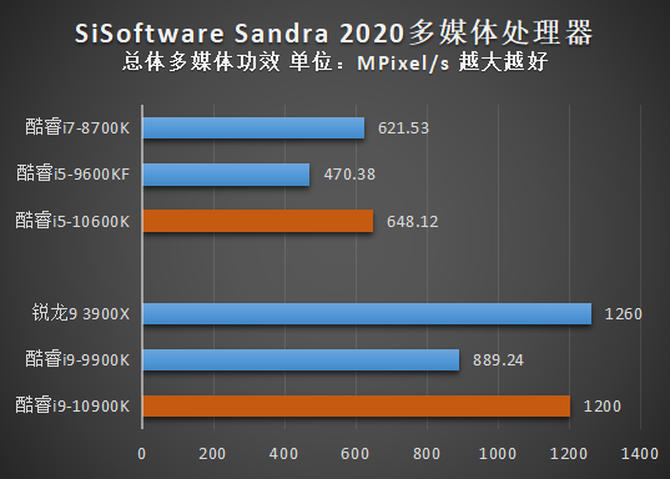 在算数处理器测试中,酷睿i9-10900K的总体本地功效高达421.29GOPS,比锐龙9 3900X的415.83GOPS也还要略高一些。在多媒体处理器中,酷睿i9-10900K的总体多媒体功效达到了1.2GPixel/s,略低于锐龙9 3900X,但相比酷睿i9-9900K也有了很大的提高。酷睿i5-10600K再此项测试中也没什么好说的,大幅领先于酷睿i5-9600KF,达到了与酷睿i7-8700K相当的水平。