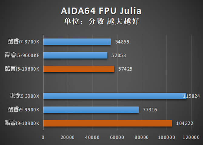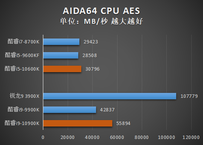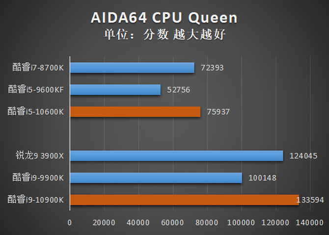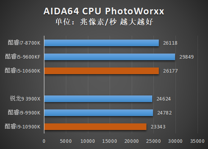 从结果中我们可以看到,酷睿i9-10900K和酷睿i9-10600K总体来看相比前代产品都有了很大的提升,其中酷睿i9-10900K在CPU Queen、CPU SHA3、FP32 Ray-Trace、FP64 Ray-Trace等项目中击败了核心数量更多的锐龙9 3900X,酷睿i5-10600K的各项测试成绩则小幅超越了酷睿i7-8700K,基本符合预期。不过值得注意的是,经过反复测试,笔者发现CPU PhotoWorxx项目对多核多线程的优化并不好,酷睿i5-9600KF在这个项目中的得分异常之高,超过规格更高的产品。