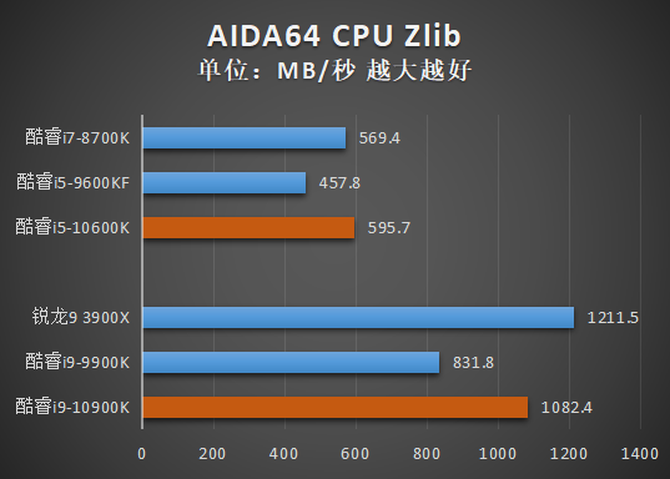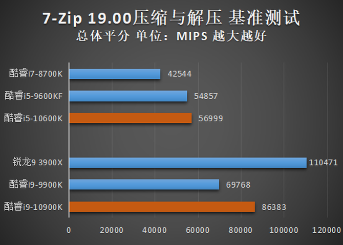7-Zip是一款完全免费而且开源的压缩软件,在当今也非常流行。虽然酷睿i9-10900K相比酷睿i5-10600K提升很大,但依旧不能战胜锐龙9 3900X。