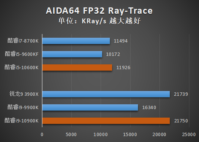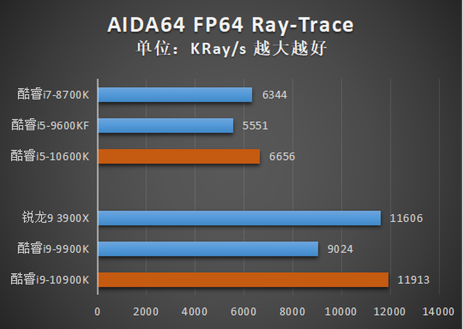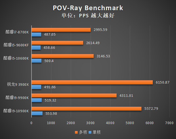 在另一项渲染测试POV-Ray Benchmark中,酷睿i9-10900K与酷睿i5-10600K相比自家前代产品的提升同样不小。