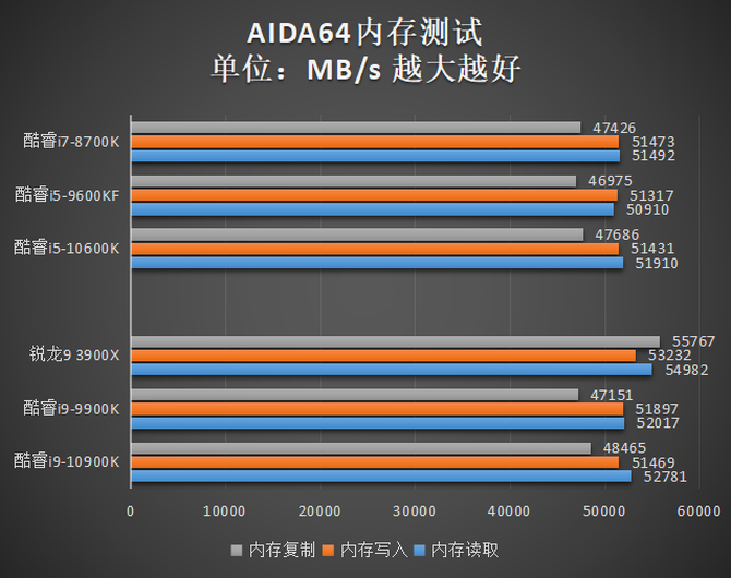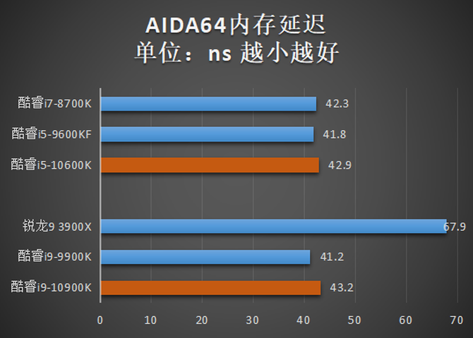 而在内存性能方面,6款处理器的读写速度基本出意一个水平,可能是由于在RingBus环形总线上又增加了2个核心的缘故,酷睿i9-10900K的内存延迟相比其他四款酷睿有了小幅增加,当然相比于锐龙9 3900X还是有巨大的优势。