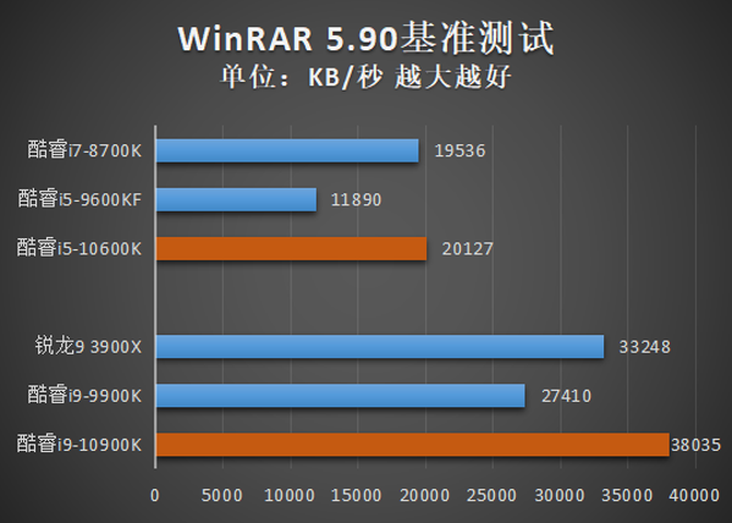 WinRAR是一款经典的压缩与解压缩软件,支持绝大多数格式。目前更新至5.90版本(不同版本的测试分数,不能进行直接对照),在自带的基准测试中,酷睿i9-10900K相比酷睿i9-9900K提升非常大,战胜了锐龙9 3900X。