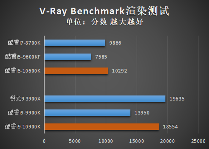 V-Ray是由专业的渲染器开发公司CHAOSGROUP开发的渲染软件,是目前业界受欢迎的渲染引擎之一,再此项测试中,酷睿i9-10900K相比酷睿i9-9900K提升很大,分数达到了锐龙9 3900X的95%左右。