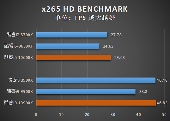 而在x265 HD benchmark中,酷睿i9-10900K和锐龙9 3900X打成了平手,结果令人惊喜。