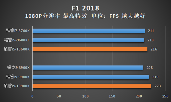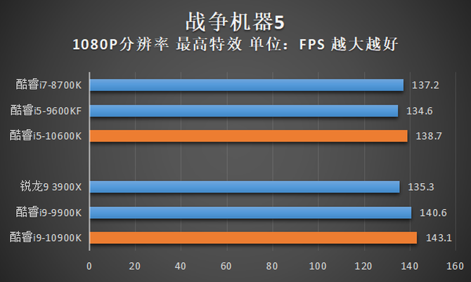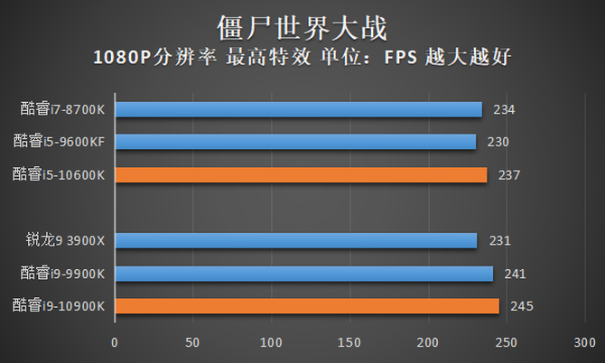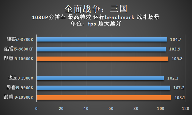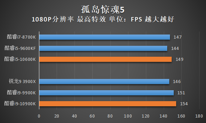 通过以上测试结果,我们可以看到,由于酷睿i9-10900K在绝大部分游戏中都可以压制住直接竞品锐龙9 3900X,对比自家上代旗舰酷睿i9-9900K,由于酷睿i9-10900K的单核/全核睿频都更高,因此在平均帧率上也有一定幅度的优势。