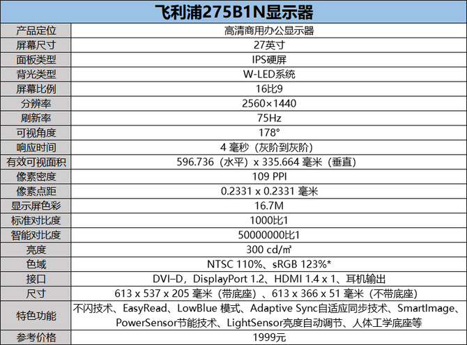 值得注意的是,飞利浦275B1N分辨率为 2560×1440(刷新率75Hz)的QHD超高清,像素点距为0.2331 x 0.2331 毫米、像素密度达到了109PPI,比传统1080P分辨率屏幕的显示效果要更细腻,无论是浏览文档表格、还是做影像处理工作,都可以获得良好的体验。