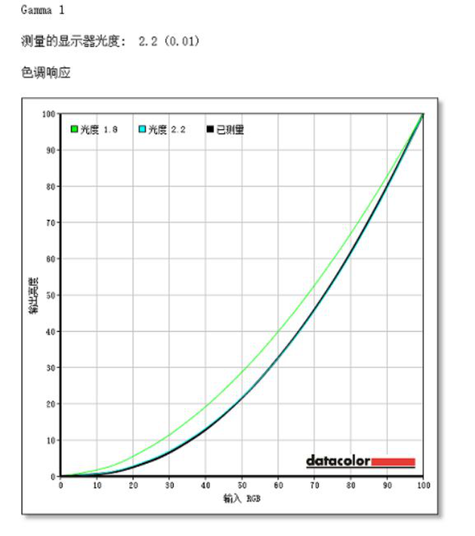 色调响应测试中,结果显示飞利浦275B1N已测量的黑色曲线应该尽量和浅蓝色的“光度2.2”曲线保持一致,以及三条曲线的重合度越小越好,可以看到实测的黑色曲线和“光度2.2”曲线几乎完全重合,微小的差异可以算是误差了,这体现出了极为优秀的色调响应能力。