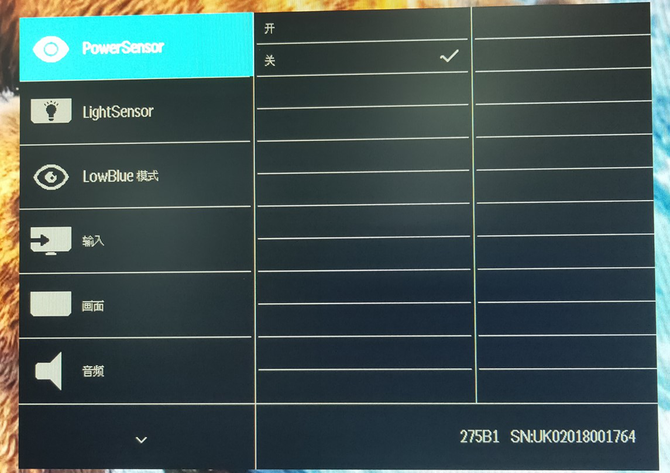 LowBlue低蓝光模式则是飞利浦旗下显示器家族的一个重要功能,打开之后就可以降低蓝光,配合不闪屏能够有效的减少蓝光对眼睛的伤害,这个功能在飞利浦275B1N中也被得到了保留与继承,开启后则可选择4种档位。左图为开启LowBlue、右图为关闭。