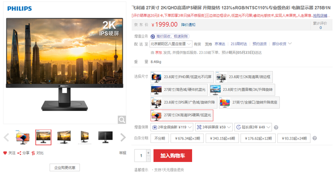 目前,飞利浦275B1N已经在京东自营旗舰店发售,指导价1999元,下单即享3年只换不修服务,据了解在618期间还会有更多优惠活动,感兴趣的用户不妨持续关注下。
