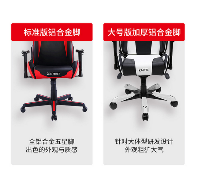 DXRACER迪锐克斯ZERO经典款电竞椅的采用的是铝合金制五星脚,保持轻量的同时增加强度,椅子牢固度有效提升,增加了安全性。后仰固定功能,配备了通过安全认证的安全托盘,具有极强承重力和稳固性。