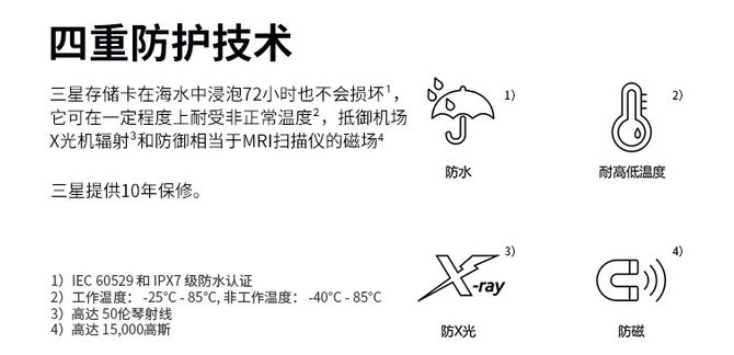 对于创作者来说,辛辛苦苦拍摄的大量素材,毫无疑问要备份备份再备份,但如果是存储设备不给力,备份再多也没用。比如在水浸、磁场、高低温环境下使用,都相当考验存储卡的性能。三星EVO Plus红色升级版+存储卡支持IPX7级防水认证,可以在海水中浸泡长达72小时也不会损坏,工作时环境温度范围-25°C-85°C。非工作温度在-40°C-85°C之间,此外,还可以抵御机场X光机辐射,以及防御相当于MRI扫描仪级别的磁场。所以,高品质才令人更放心。此外,三星官方还提供10年超长有限保修,使用无忧。